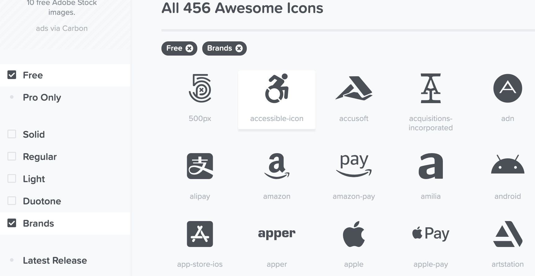 무료 애플 로고를 사용하기 위해 free 와 Brands 를 누르면 찾을 수 있습니다.