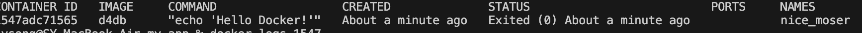 해당 의미는 ubuntu 이미지를 생성하고 컨테이너를 생성 및 실행되자 마자, Hello, Docker! 가 실행이 되도록 하는 것입니다.