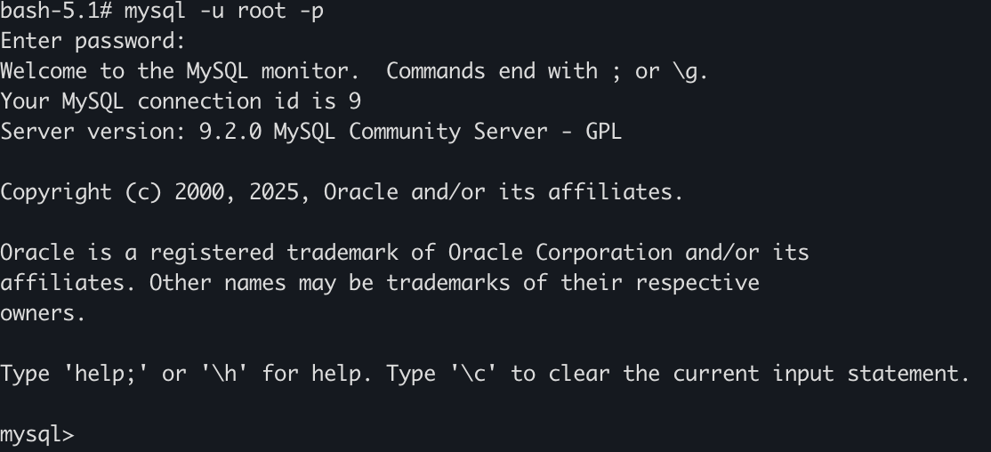 실제 접속을 하기 위해 컨테이너 접속 후 MYSQL 에 접근합니다.